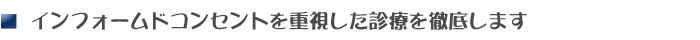インフォームドコンセントとは医学用語で、治療や手術などに際し、医師が病状や治療方針を分かりやすく「説明」し、患者の「同意」を得ることです。動物病院にとって「患者」は動物たちですが、当院では飼い主様にペットの症状や病気について説明し、治療法を提示し、同意を得て治療を行うことが動物病院におけるインフォームドコンセントの意義と考えています。治療法が複数ある場合には、現在の病状やそれぞれの治療法について十分な説明をさせていただきます。そしてその中から、飼い主様の考え方やライフスタイルに応じた治療法を、飼い主様自身に選択していただいて治療を行います。治療や症状について、少しでもわからないことがありましたらいつでもご質問ください。動物病院と飼い主様が「二人三脚」で治療に取り組めるよう努めていきます。